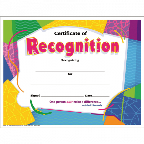 Mark achievement throughout the year. Take every opportunity to honour older students as well as adult volunteers and staff. Printer-compatible and ready to frame Recognition. Certificates offer dynamic designs and positive messages. 8-1/2 x 11. 30/pkg.