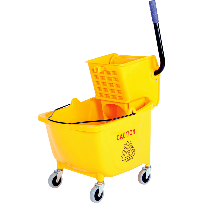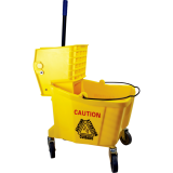 Easy one-handed transport. When space is an issue this bucket and wringer is the answer. Wringer has clip to hold mop handle in place. Smooth Surface for easy cleaning. Covered spring to prevent injuries. Can accommodate 12oz-32oz mops. Non-marking 3? casters. 33.12 L. 21"W x 16"D x 34-1/2"H. Yellow.
