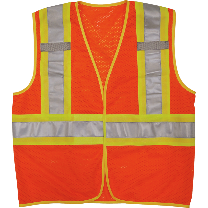 Lightweight and comfortable, fluorescent sport mesh knit fabric. 4" orange/silver reflective stripes offer maximum nighttime visibility. CSA compliant. 360° horizontal stripe around torso, two vertical stripes on front and 'X' on back. Front hook and loop closure permits optimal fitting. Medium. Orange.