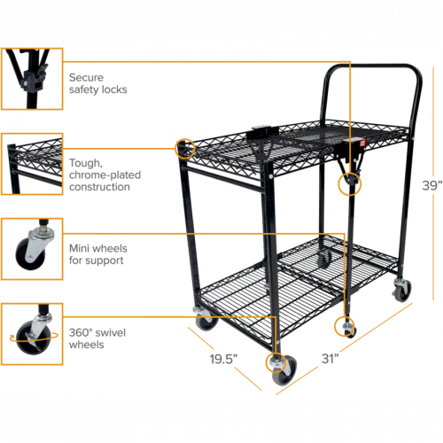 Patented folding design allows for simple and convenient storage when not in use. Dual shelves provide extra storage space. Medical style no-mar swivel wheels for quiet operation and easy maneuverablilty. Metal. 400 lb. capacity. 31"W x 19-1/2"D x 39”H. Black.