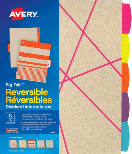 Add some fun and flair to schoolwork organization with our Big Tab™ Kraft Reversible Dividers. These reversible dividers let you choose from a solid kraft brown paper with colour accents or colourful patterns.