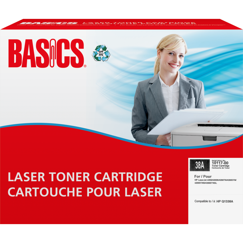 Basics® Brand cartridges are manufactured at North American ISO 9001:2000 registered facilities using returned, original equipment cartridges. These cartridges are designed, engineered and manufactured to meet OEM performance while ensuring top quality and consistent output. OEM# 38A. Basics®. HP LaserJet 4200, 4200N, 4200TN, 4200DTN, 4200DTNS, 4200DTNSL. Contains a minimum of 85% post-consumer recycled material. Yields 12,000 pages. Black.