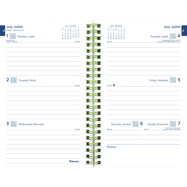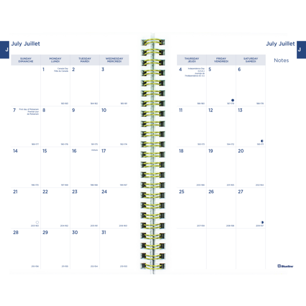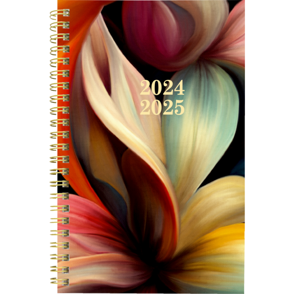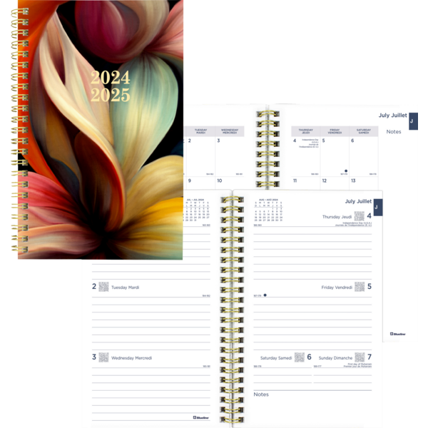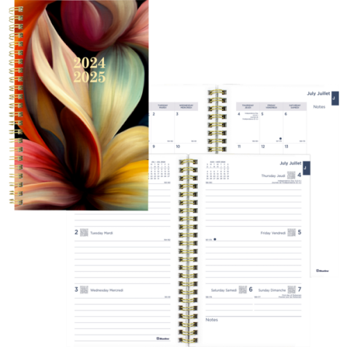FSC® Certified. Contains 100% post-consumer recycled material. Gold twin-wire binding. Translucent poly cover with gold foil stamping. Week-to-view format with ruled space for each day of the week. Monthly planner before each month. 13-month, July - July. 4-colour stickers for visual reminders. Note boxes on each spread. Includes three-year planner, periodic table, multiplication table, metric conversions and map of North America. 8" x 5". Bilingual. Multicolour Tropical Flower.