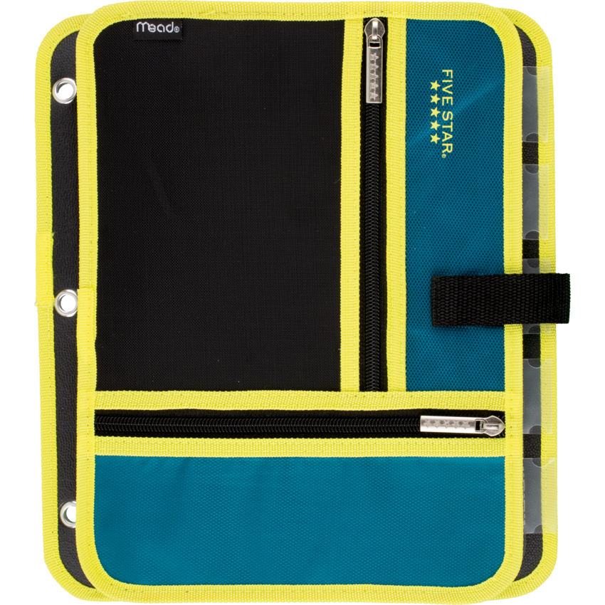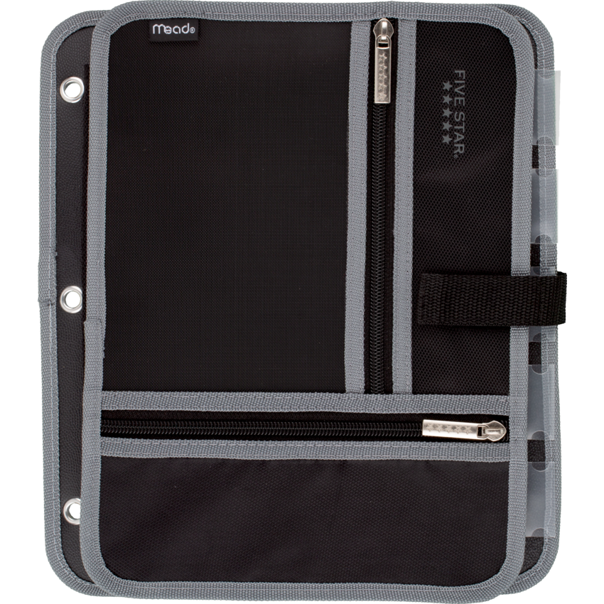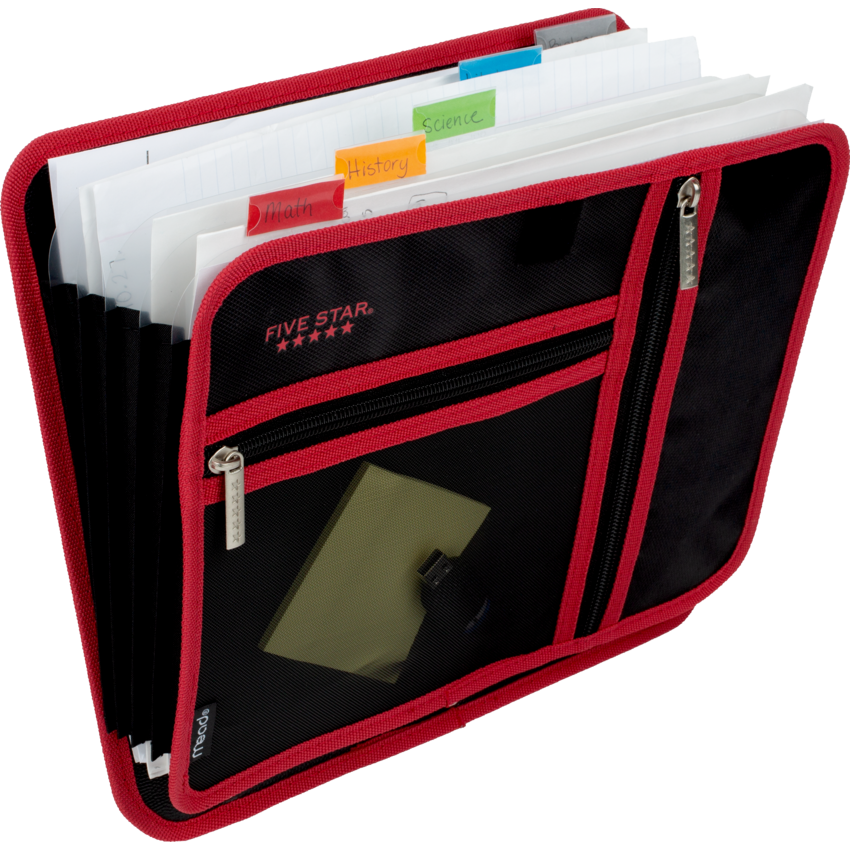 Provides students with added organization that can be used with or without a binder. 5-tab expanding file for quick and easy paper organization, 3-ring binder compatible - carry on its own or in a binder. 2 secure zipper pockets for storage of small items, and additional paper storage on the back. Secure hook & loop closure. 1/2" capacity. 10-1/2" x 12". Assorted Colours.