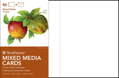 These blank cards are made of 400 Series Mixed Media heavy-weight 140lb. (300gsm) paper. The acid-free paper features the attributes of a watercolor paper but with a vellum drawing finish, making the cards ideal for watercolor, gouache, acrylic, graphite, pen & ink, colored pencil, marker and collage. Each pack includes fifty cards and envelopes. This small card is ideally suited for formal announcements, gift enclosures, invitations, change of address and thank you notes. The full size cards measure 5" x 6.875" and include 5.25" x 7.25" envelopes.