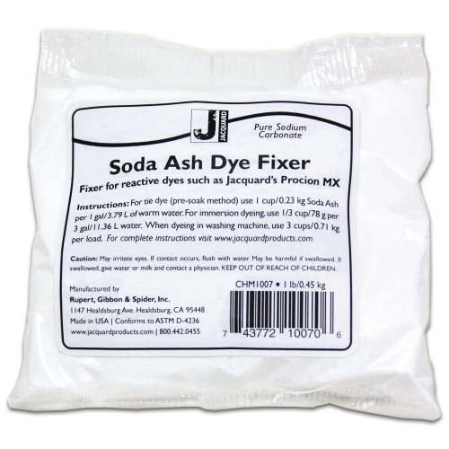 Soda Ash is also known as sodium carbonate, washing soda, or sal soda. A mild alkali that promotes the chemical reaction between Procion MX fiber reactive dye and cellulose fibre. Soda Ash is necessary to activate and "set" Procion dye with cotton and other cellulose fibre.