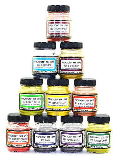 Procion MX dyes are “cold water dyes” that are fixed chemically instead of with heat. This unique property sets Procion MX apart from all other dyes and establishes them as the undisputed king of backyard dyeing, batik and tie dye. Because Procion MX dyes can be used away from the stovetop, they are also the ideal colours for shibori, ice dyeing, tub and low water immersion dyeing, printing, direct painting and other “alternative” dye applications. As a fibre-reactive dye, Procion MX forms a strong covalent bond with cellulosic fibres, making it the most permanent and washfast of all dyestuffs.