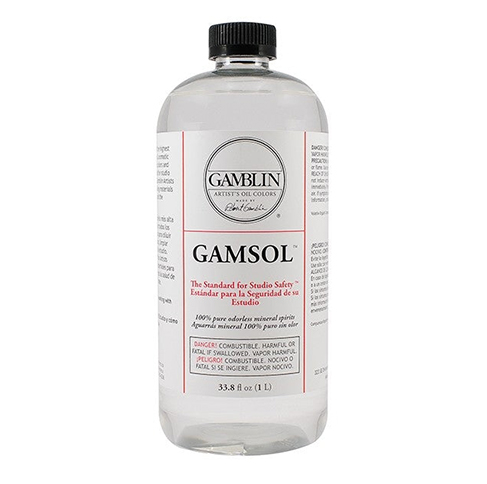 Gamsol is an excellent solvent for thinning Gamblin mediums and for general painting. It evaporates 100% and leaves no residue in paint layers. Gamsol is less toxic than other brands of OMS (Odorless Mineral Spirits), mineral spirits, or turpentine because the harmful aromatic solvent component has been removed. It's also useful for studio and brush cleanup.