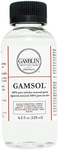 Gamsol is an excellent solvent for thinning Gamblin mediums and for general painting. It evaporates 100% and leaves no residue in paint layers. Gamsol is less toxic than other brands of OMS (Odorless Mineral Spirits), mineral spirits, or turpentine because the harmful aromatic solvent component has been removed. It's also useful for studio and brush cleanup.