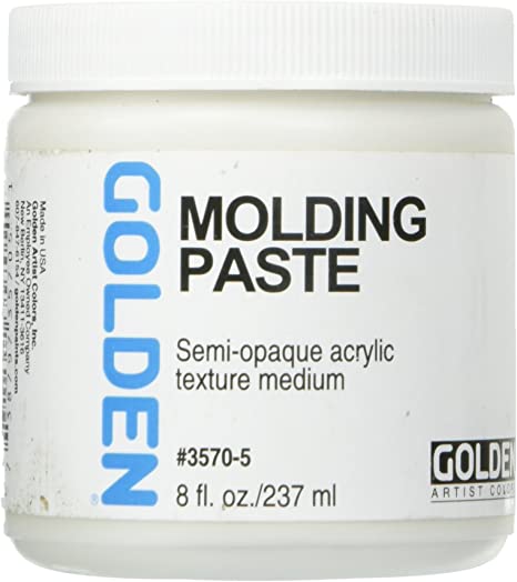 Golden Pastes can be used to achieve a variety of effects and expressions. When used in conjunction with acrylic colours they broaden working properties and expand creative possibilities. Unlike gels, pastes are opaque because they contain Marble Dust or other fillers that create a white or clay-tone finish with a variety of textures and properties. Molding Paste can also be used to create foundations for painting either to create texture over a smoother surface, or to smooth out a textured surface. The absorbent qualities of Molding Paste make it suitable as a ground for nearly every painting and drawing media.