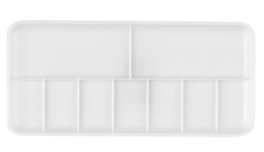 Made of durable, solvent-resistant plastic for use with oils, acrylics, or watercolours, these bright white, plastic palette trays have several round wells, plus slanted wells that allow water or thinner to collect away from the paint. Ideal for the classroom, they are a visual and neat way for children to find the colours they want to use while capturing their masterpieces. This pure white tray is available in an easy to clean heavy-duty plastic and an economic lightweight plastic. 3-5/16" x 7-1/8"