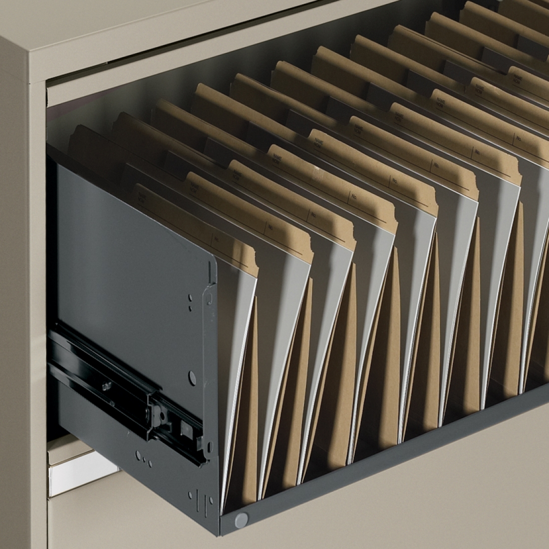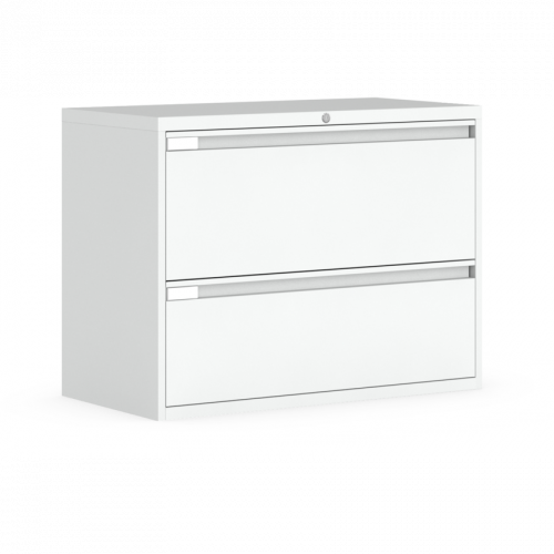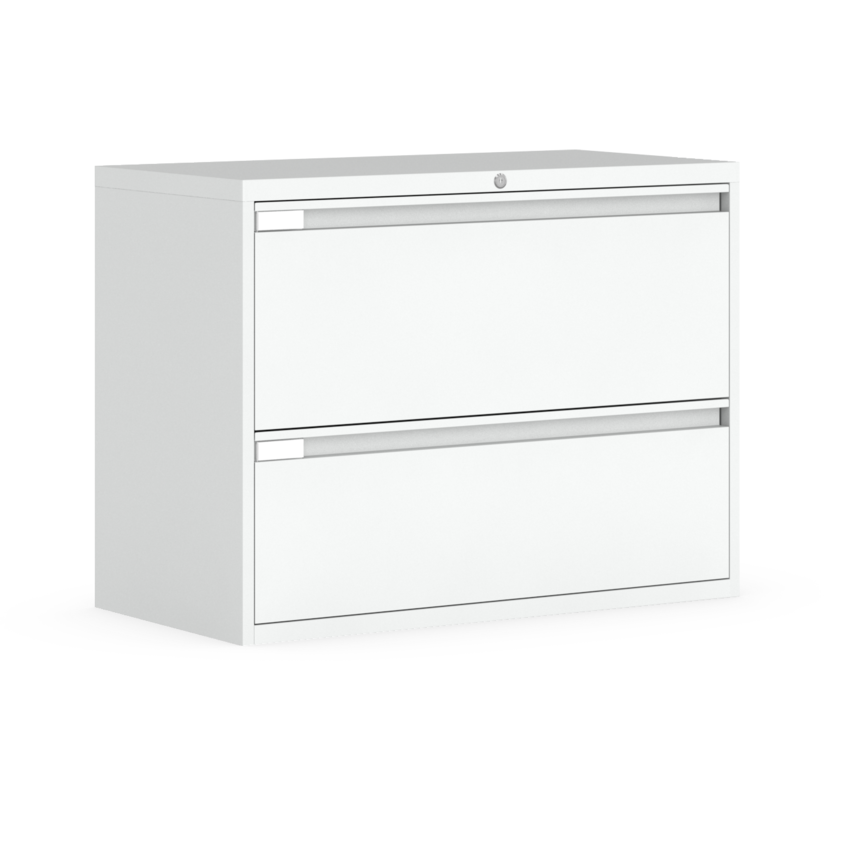 All fixed front lateral file drawers (“B” & “L”) hold letter, legal and A4 metric file sizes with side-to-side hanging file bars provided.
