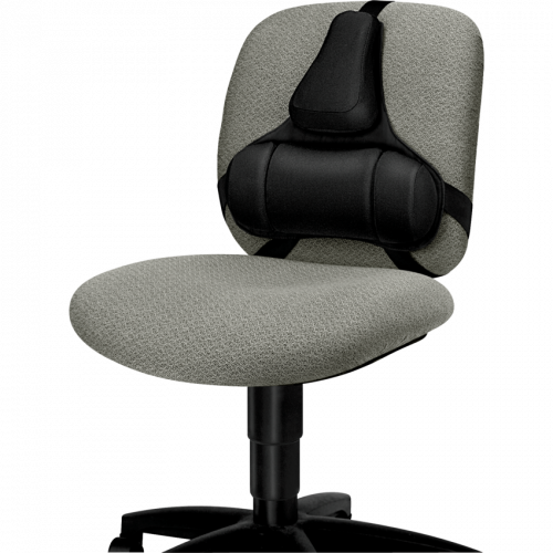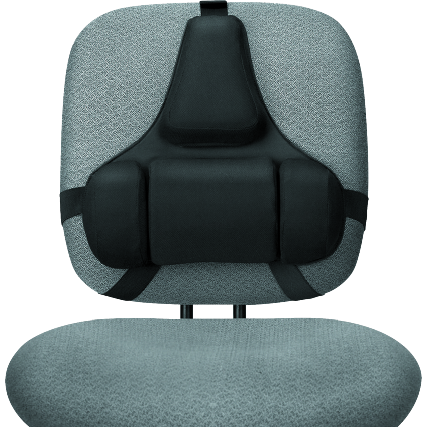 Lower lumbar support with three memory foam sections conforms comfortably to natural body curvature. Tri-Tachment™ system ensures stability and eliminates the need for readjustment. 14-1/2"W x 2"D x 15"H. Black.