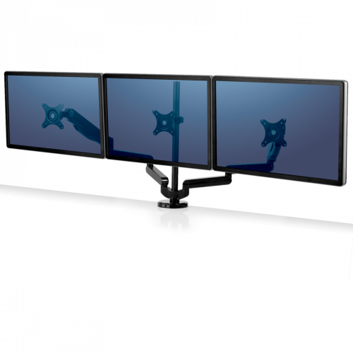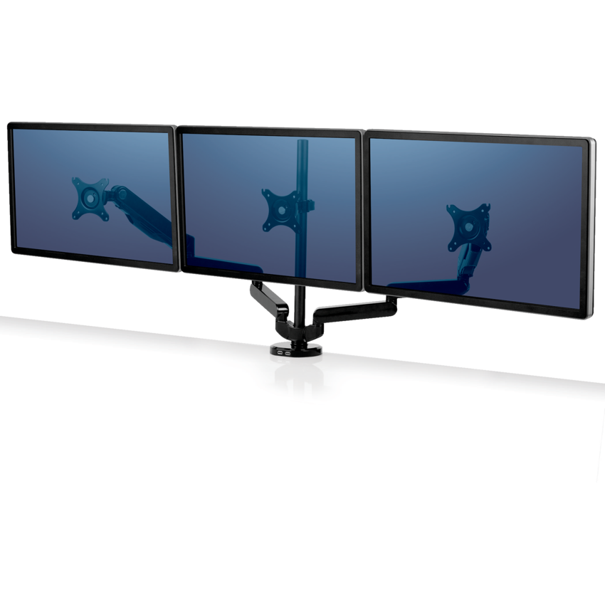 Increase valuable desk space and easily adjust your monitor to reduce eye, neck and shoulder strain. Mounts via clamp or grommet. Triple Arm. Two USB 3.0 ports located at the base of the product. Meets VESA mounting standards. Height range from 5-1/3" to 16-1/3". Tilts -45° to +45°. 2-1/2" to 26-1/2" depth adjustment. Rotates 360°. For monitors up to 17.6 lbs (32") on each arm. Black.