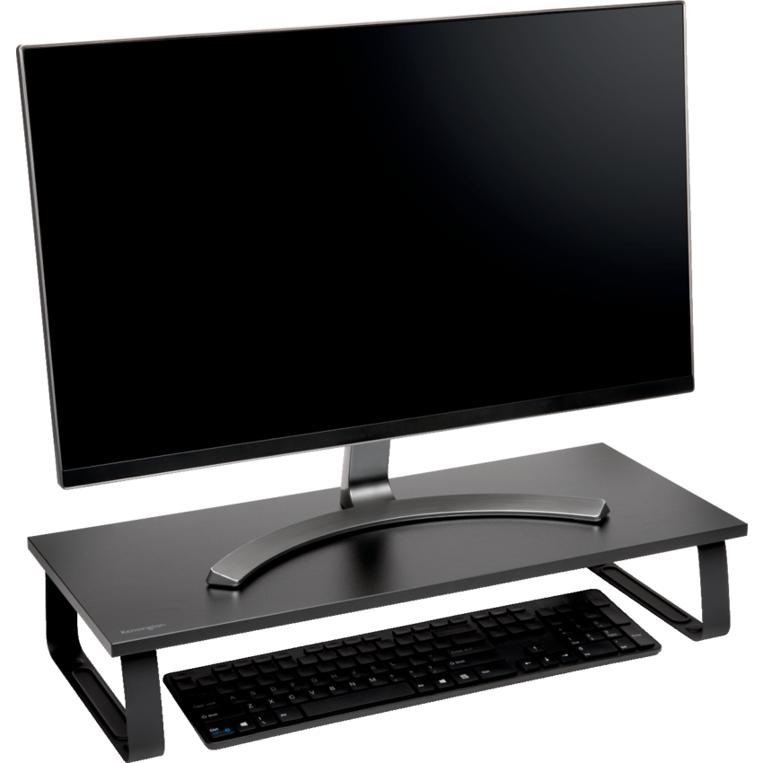 Combine a durable and stylish design with the ergonomic benefits of raising your monitor height. The extra wide platform offers an organized working environment with plenty of space underneath to store a full-size keyboard and accessories. The steel base. Supports monitors up to 32" and 44 lbs. 25-1/3"W x 11-2/5"D x 2-2/5"H. Black.