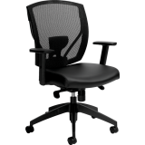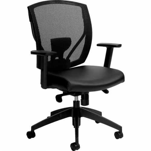 Medium Back. Pneumatic seat height adjustment. Seat range from 16-1/2" to 20-1/2". Back tilts 2 degrees for every 1 degree the seat tilts. Waterfall seat edge. Multi position tilt lock & tilt tension adjustment. Lumbar support with height adjustment. TIlt tension adjustment. Height adjustable arms with durable self-skinned urethane armcaps. Dual wheel carpet casters. 51 lbs. 26"W x 26-1/2"D x 39-1/2"H. Assembly not included. Mesh back and Leather seat. Luxhide. Black.