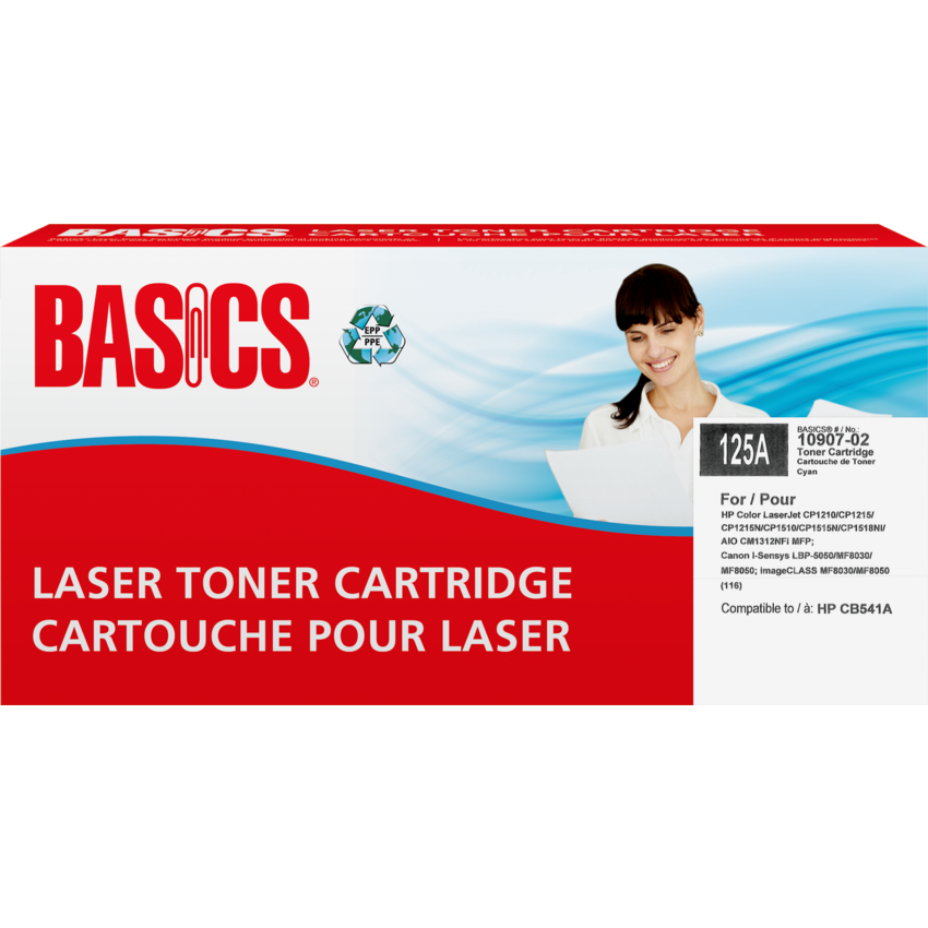 Basics® Brand cartridges are manufactured at North American ISO 9001:2000 registered facilities using returned, original equipment cartridges. These cartridges are designed, engineered and manufactured to meet OEM performance while ensuring top quality and consistent output. OEM# 125A. Basics®. HP Color LaserJet CP1210, CP1215, CP1215N, CP1217, CP1510, CP1515N, CP1518NI, AIO CM1312NFI MFP, I-Sensys LBP-5050, MF8030, MF8050CN, imageCLASS MF8030, MF8050CN, MF8080CW. Contains a minimum of 87% post-consumer recycled material. Yields 1,400 pages. Cyan.