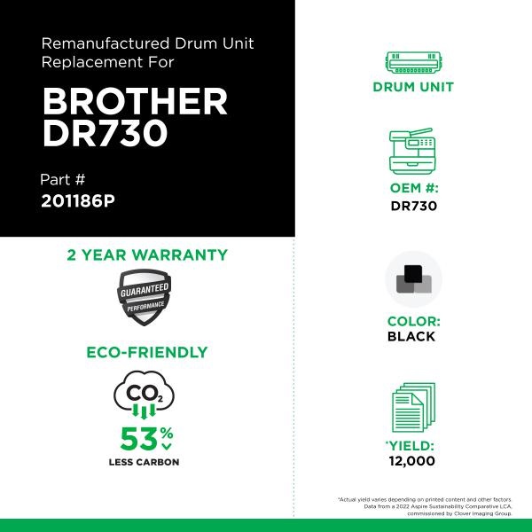 Designed to be a true quality alternative to the OEM while offering significant savings. Manufactured in ISO 9001:2008 certified North American facilities. 100% guaranteed to meet or exceed OEM performance. OEM# DR730. Clover Imaging. Brother DCP-L2550DW; HL-L2350DW, HL-L2370DW, HL-L2370DW XL, HL-L2390DW, HL-L2395DW; MFC-L2710DW, MFC-L2750DW, MFC-L2750DW XL. Yields 1,2000 pages. Black.