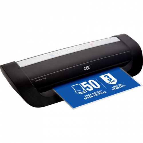 12" document entry width. Auto pouch thickness detection. Auto jam detection and removal. Cold lamination setting option. Ready in 45-60 seconds. Includes 50 EZUse™ Premium laminating pouches. Accepts 1.5 to 10 mil pouches. 55"/minute laminating speed. 3-year warranty. 22-3/4"W x 9-1/4"D x 4-3/4"H.