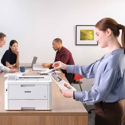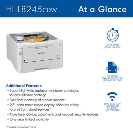 The Brother Workhorse HL-L8245CDW digital colour printer is a great choice for small businesses, busy offices, and small workgroups. This compact printer delivers vivid colour and sharp black output at fast print speeds up to 31ppm. Offers cost-efficient printing by using the Brother Genuine TN229XXL super high-yield replacement toner cartridges. Triple Layer Security features help to limit document and device access and protect against network intrusions. Includes a 250-sheet capacity paper tray and an optional tray to help minimize paper refills. Flexible connectivity with Gigabit Ethernet and dual band wireless networking, plus convenient mobile device printing.
