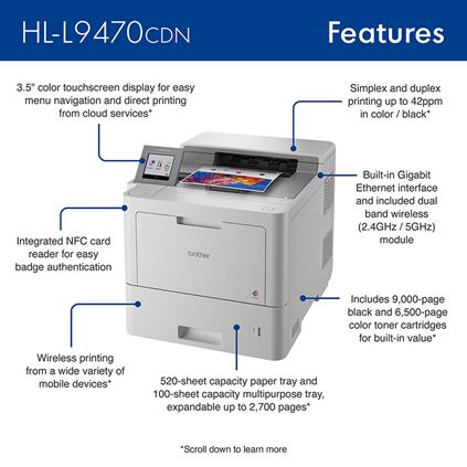 The Brother Workhorse HL‐L9470CDN Enterprise Colour Laser Printer is designed for how work now works – providing enterprise‐level performance, advanced security features, and bold colour output in a compact footprint that is ideal for mid to large‐sized workgroups. This high performance printer helps to increase productivity with fast print speeds up to 42ppm in both simplex and duplex. Offers built‐in value with included standard‐yield toner cartridges and a low total cost of ownership by using Brother Genuine TN815 super high‐yield replacement toner cartridges. Triple Layer Security features help to limit document and device access and protect against network intrusions. Offers a large standard paper capacity that is scalable as your business needs grow. The HL‐L9470CDN also offers flexible connectivity with Gigabit Ethernet and dual band (2.4GHz / 5GHz) wireless networking, plus convenient printing from mobile devices.