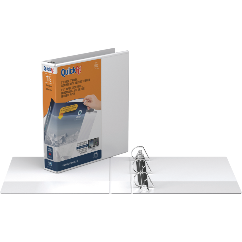 Customize the front cover and spine at the same time with a wraparound, easily loaded sheet. Rings mounted on back to allow pages to lie flat. See quickfitbinders.com for easy to use templates. Features ink transfer-resistant overlay. Interior front and back cover pockets. PVC free polypropylene material. 1-1/2" capacity. White. Also available in a carton of 14.