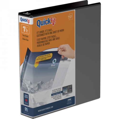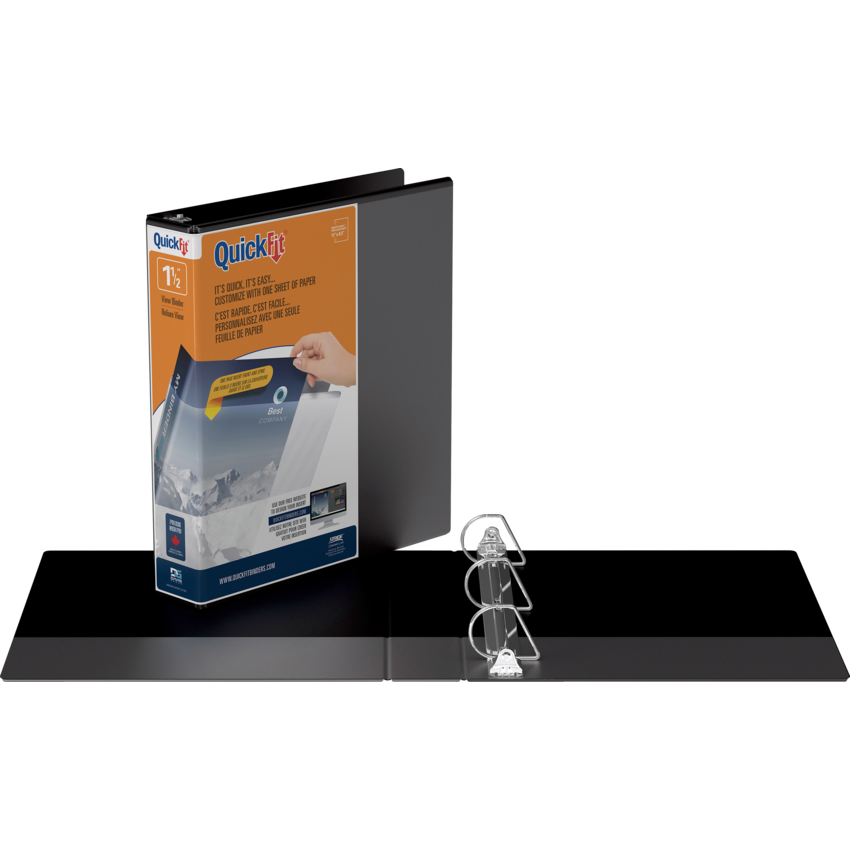 Customize the front cover and spine at the same time with a wraparound, easily loaded sheet. Rings mounted on back to allow pages to lie flat. See quickfitbinders.com for easy to use templates. Features ink transfer-resistant overlay. Interior front and back cover pockets. PVC free polypropylene material. 1-1/2" capacity. Black. Also available in a carton of 14.