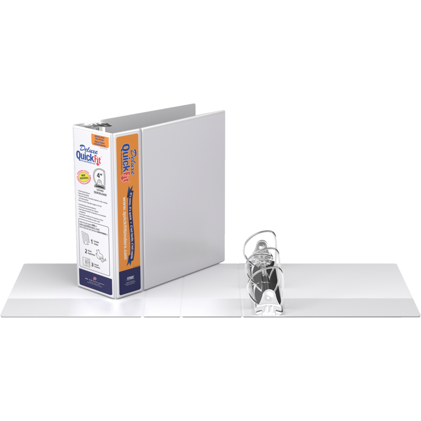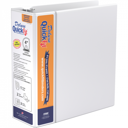 Customize the front and spine with a single, letter size sheet. Double hinged front cover saves space on shelf and is more durable. The Quickload rings have minimal curve for easy loading. Back mounted rings allow pages to lie flat. Contains a minimum of 36% post-consumer recycled material. See www.quickfitbinders.com for easy to use templates. Features ink-transfer resistant overlay. Interior front and back cover pockets. Locking Rings. Polypropylene. 4" capacity. White. Also available in a carton of 6.