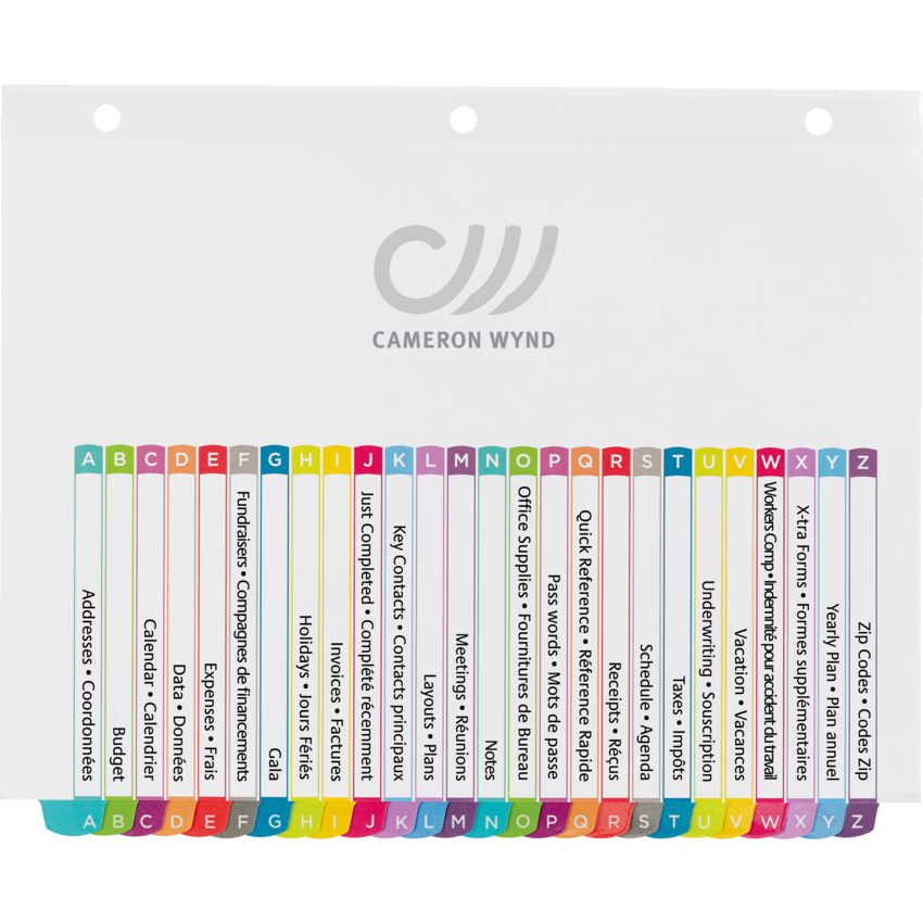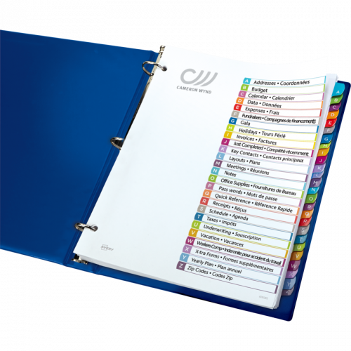Contemporary look with arched tabs. Extended tab reinforcement, double-sided hole reinforcement, and heavyweight paper prevents tearing and adds durability. Print or write on the table of contents and photocopy to create multiple sets of professional inde. Double-sided contents sheet offers the flexibility to use in either portrait or landscape orientation. A-Z. Laser and inkjet compatible. 11" x 8-1/2".