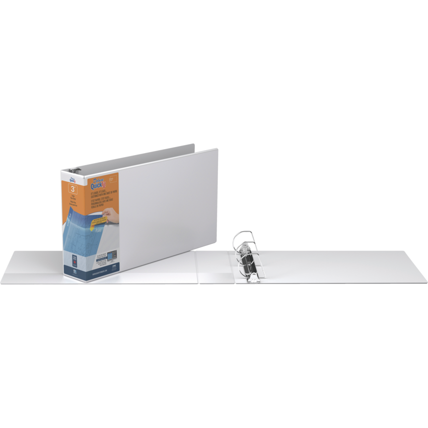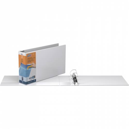 Create a one-piece custom insert that wraps around the spine to front cover. Back mounted rings allow pages to lie flat. See www.quickfitbinders.com for easy to use templates. Features ink transfer-resistant clear wrap-around overlay. Interior front cover pocket. 3 locking angled rings. Polypropylene material. 3" capacity. 11" x 17". White.
