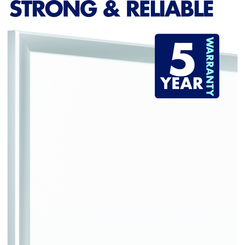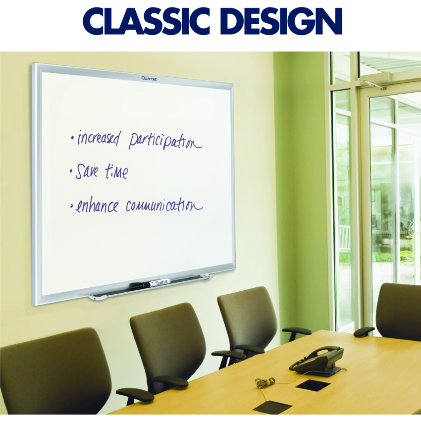 Durable platform for effective brainstorming, project organizing, note taking and more. Can be mounted horizontal or vertical Nano-Clean technology prevents ink from penetrating the board surface. Streak-free with exceptional ghost and stain resistance. Aluminum frame. Includes accessory tray, one dry-erase marker and mounting hardware. 5-year limited warranty. 48" x 36".