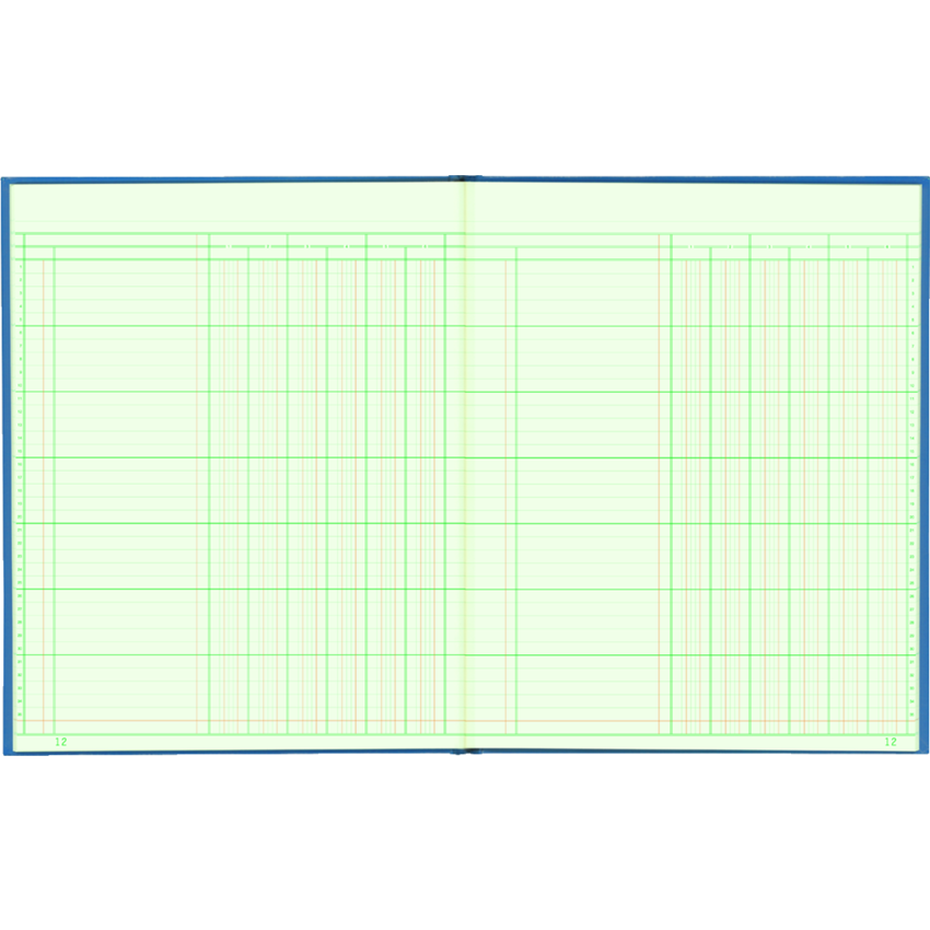 Green tinted paper with green and brown rulings and a perforated, tear-off heading section to eliminate repetitious writing. Contains a minimum of 50% post-consumer recycled material. FSC Certified®. Perfect bound. Hard cover. 6 Columns. Single page. 80 numbered pages. 12-1/4” x 9-7/8”.