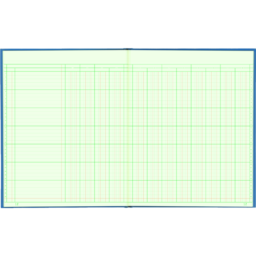 Green tinted paper with green and brown rulings and a perforated, tear-off heading section to eliminate repetitious writing. Contains a minimum of 50% post-consumer recycled material. FSC Certified®. Perfect bound. Hard cover. 12 Columns. Double page. 80 numbered pages. 12-1/4” x 9-7/8”.
