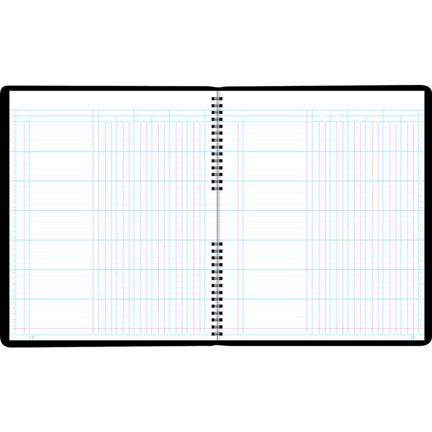 Pages with perforated, tear-off heading section to eliminate repetitious writing. Feint rulings. Contains a minimum of 50% post-consumer recycled material. FSC® Certified. Split twin wire bound. Flexible cover. White paper with red and blue ruling, numbered. 6 Columns. Single page. 80 pages. 12" x 10".