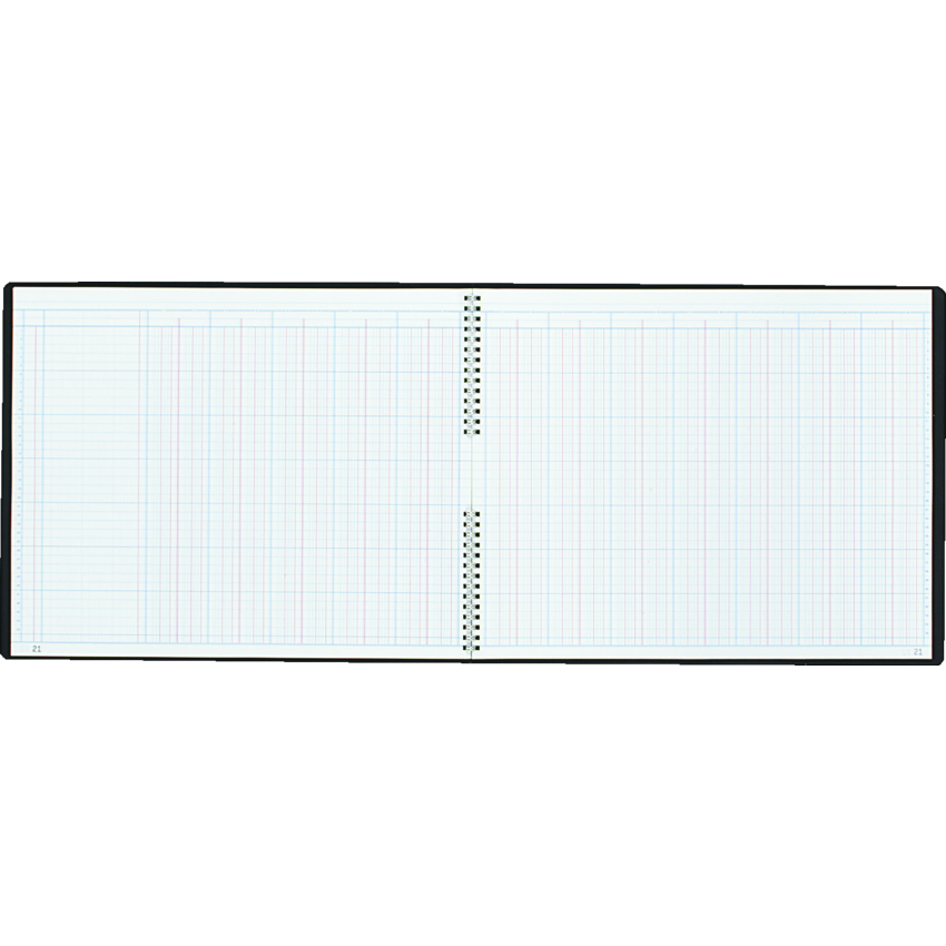 Red and blue ruling on white bond paper. Pages with perforated, tear-off heading section to eliminate repetitious writing. Double page rulings: 24, 30, 36 columns. Contains a minimum of 50% post-consumer recycled material. FSC® Certified. Split twin wire bound. Flexible cover. 24 Columns. 80 numbered pages. 12" x 14-15/16".