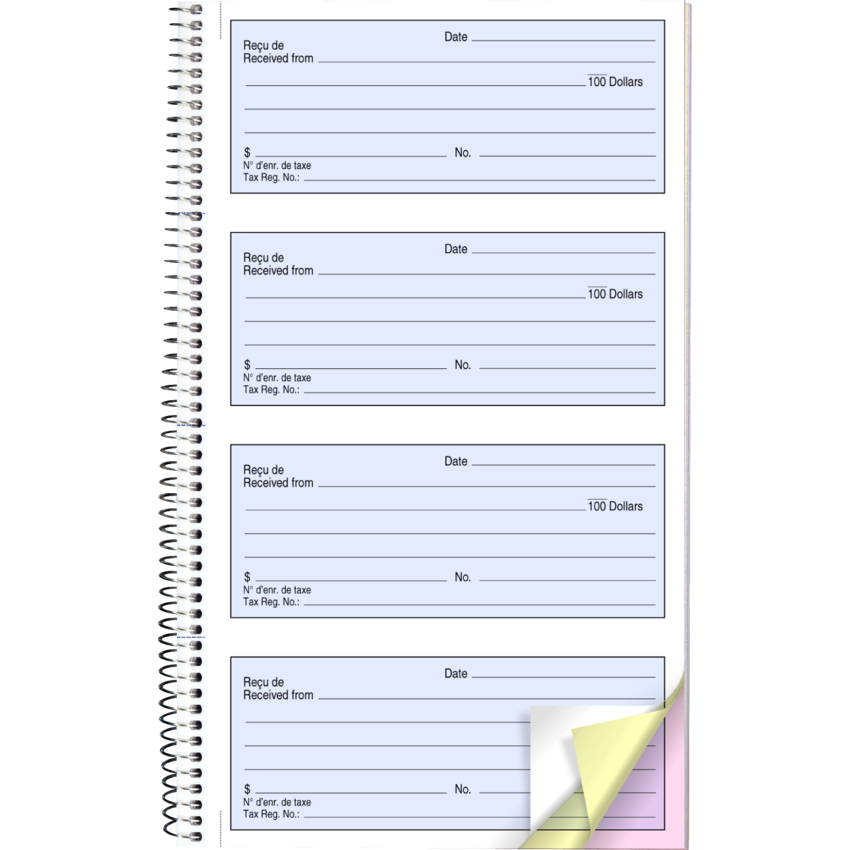 Safety tint on original rubs off if erased. Carbonless. Flexible cover. Spiral bound. 3-part. 4 receipts per page, 100 receipts per book. 10-5/8” x 6-5/8”. Bilingual.