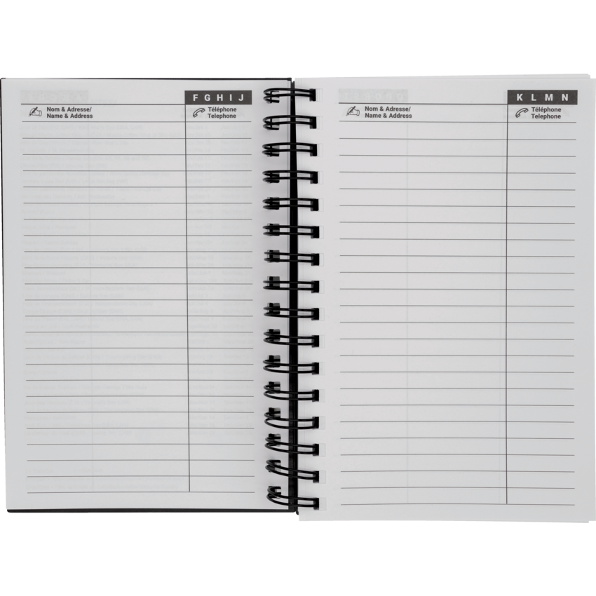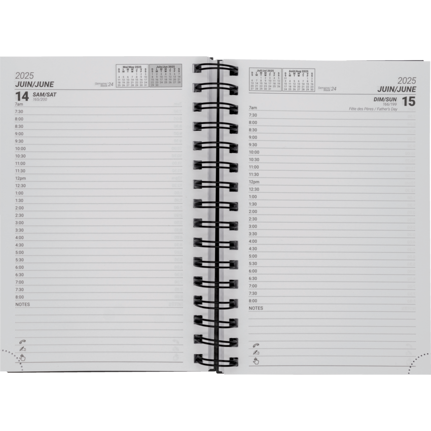 Twin coil wire bound. Poly Cover (1 mil). 1 page per day. 7:00 a.m. to 8:00 p.m. in 1/2 hour intervals. Pages with perforation, elastic closure, telephone and address section. 8" x 5". English. Black.
