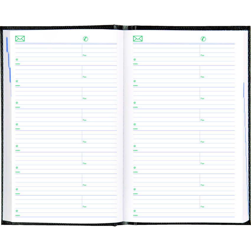 Contains a minimum of 50% post-consumer recycled material. FSC® Certified. Perfect bound. Hard, lizard-like cover. 1 page per day. 7:00 a.m. to 7:30 p.m. in 1/2 hour intervals. Notebox on each page Monthly expense section at the end of each month. 8" x 5". Bilingual. Black.