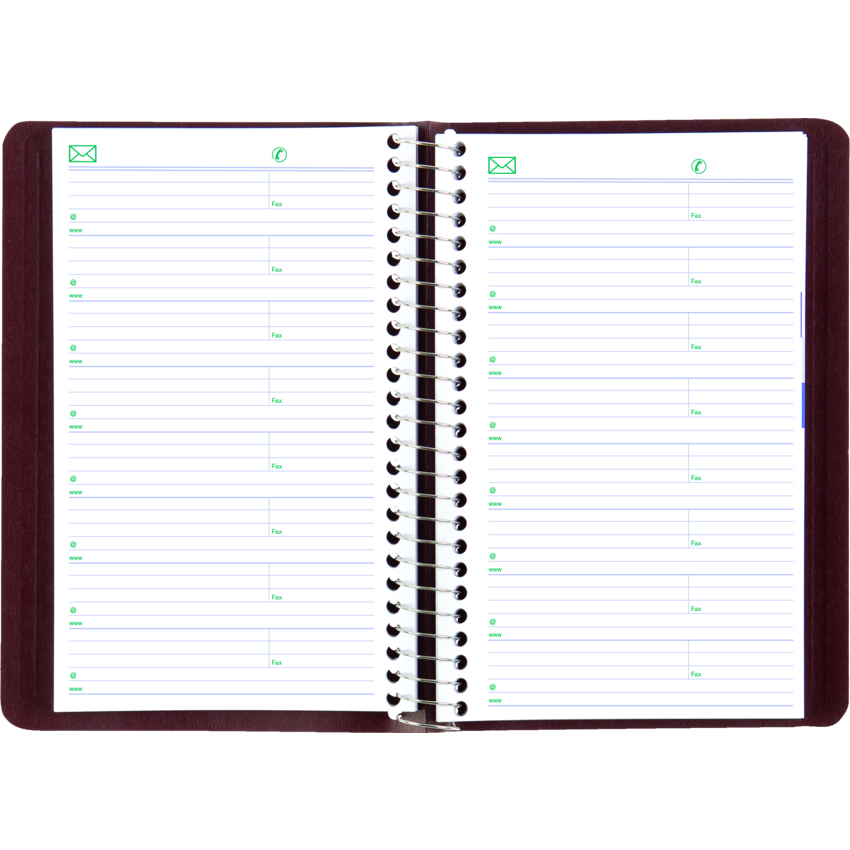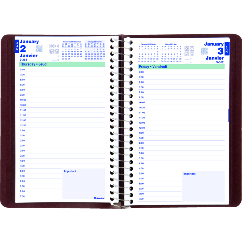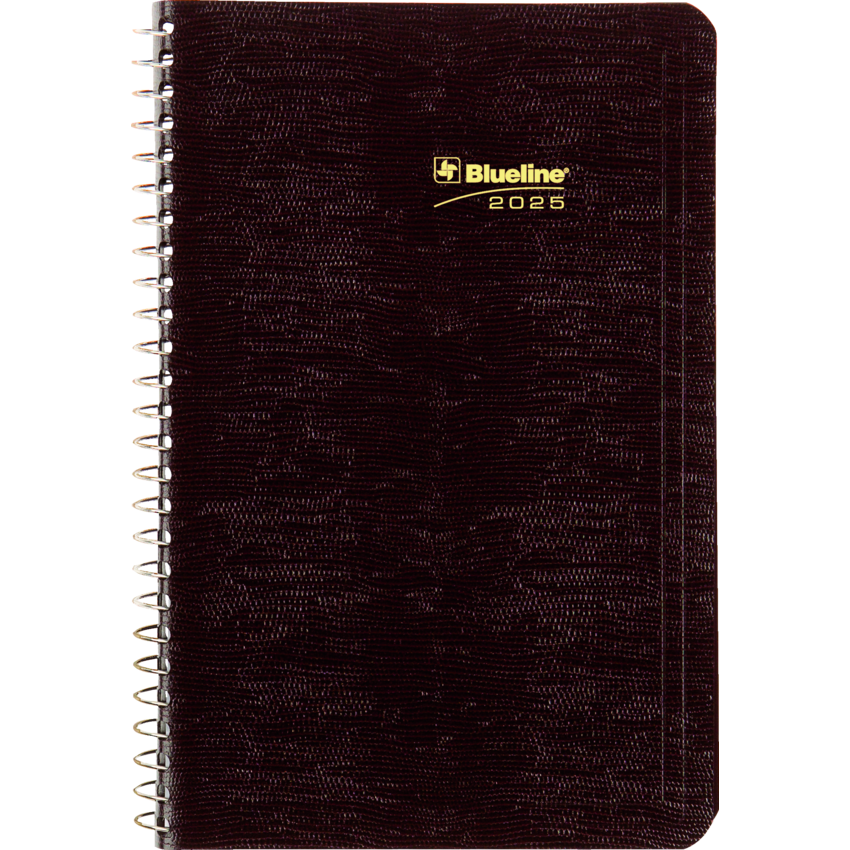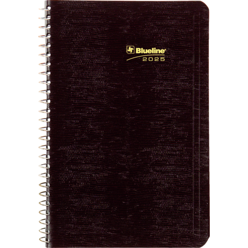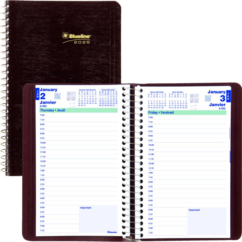 Contains a minimum of 50% post-consumer recycled material. FSC® Certified. Spiral bound. Soft, lizard-like cover. 1 page per day. 7:00 a.m. to 7:30 p.m. in 1/2 hour intervals. Note box on each page. Monthly expense section. 8" x 5". Bilingual. Burgundy.