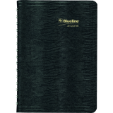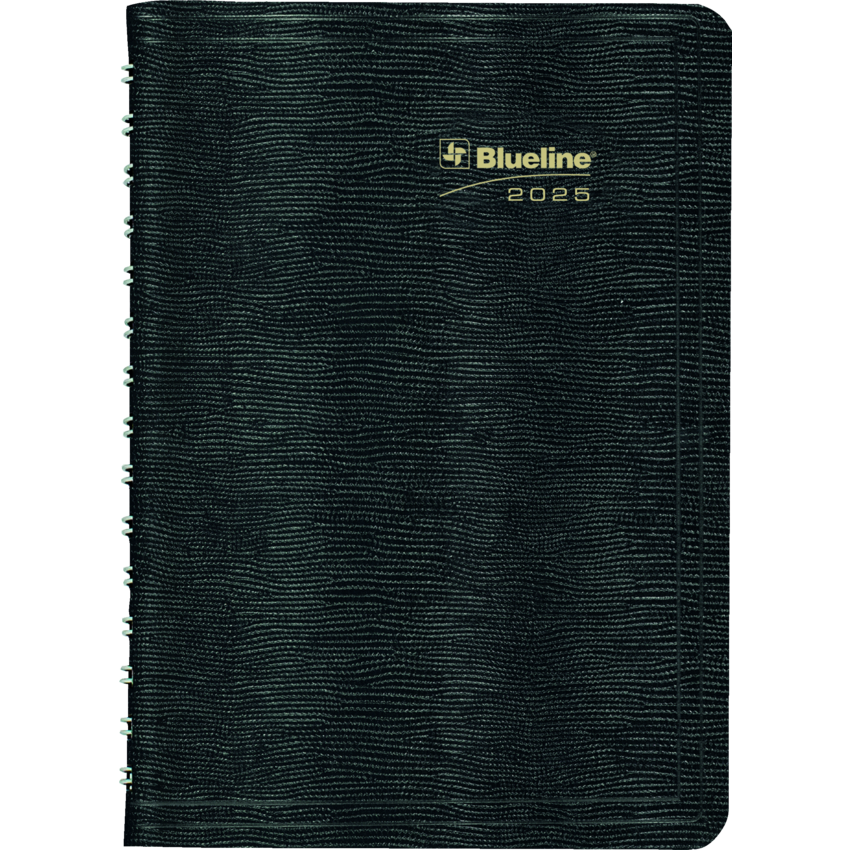 Contains a minimum of 50% post-consumer recycled material. FSC® Certified. Twin wire bound. Soft, lizard-like cover. 2 days per page. 7:00 a.m. to 6:30 p.m. in 1/2 hour intervals. Note box on each page. Telephone and address section. 8” x 5”. Bilingual. Black.