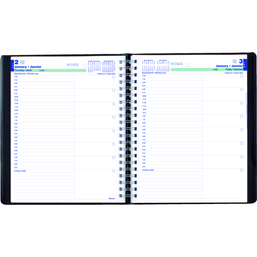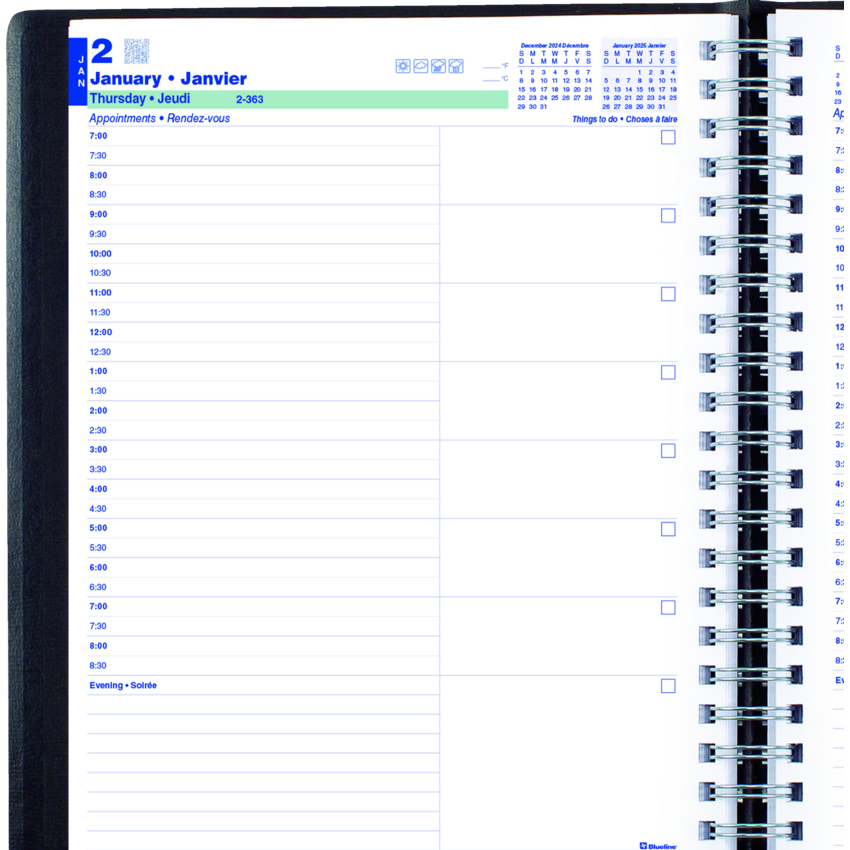 Contains a minimum of 50% post-consumer recycled material. FSC® Certified. Twin wire bound. Soft, lizard-like cover. 1 page per day. 7:00 a.m. to 8:30 p.m. in 1/2 hour intervals. Features space for evening appointments. “Things to do” section. 11" x 8-1/2". Bilingual. Black.