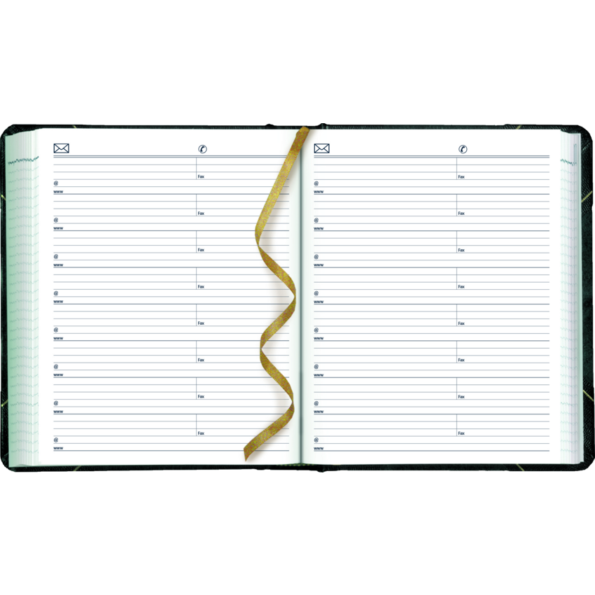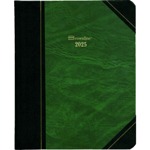 Contains a minimum of 50% post-consumer recycled material. Sewn binding. Hard, marble cover. 1 page per day. 7:00 a.m. to 7:00 p.m. in 1/2 hour intervals. Space for evening appointments. Cash record section. Includes gold ribbon bookmark and telephone/address section. 8-1/8" x 6-9/16". English. Green with Black spine.