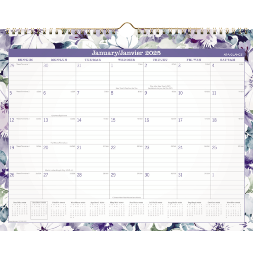 Plan, set, achieve goals, and track important notes. High-quality paper features ink bleed resistance. Built-in hanging loop for easy wall display. 1 page per month. Lined daily squares for easy writing. Gold twin wire bound at top. Full year reference calendar on each page. 12 months (January to December). 15" x 12". Bilingual. Purple/Green.