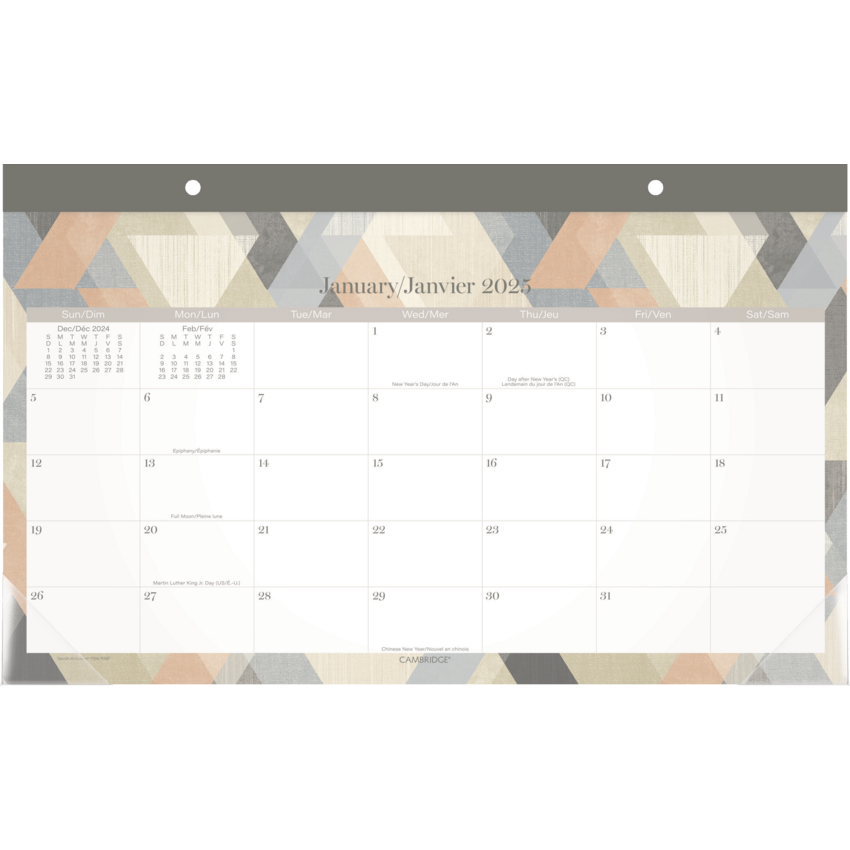 Bring strong geometric designs, solid colors and gold accents to your plans. 12 months (January-December). 1 month per page 1 block per day. Past and future reference calendars on each page. Eyelets for hanging. 17-3/4” x 11”. Bilingual. Multicolour.
