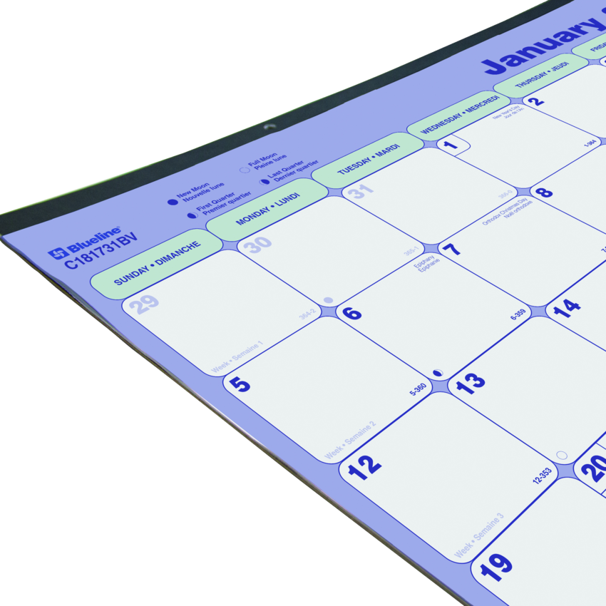 Features: Reference Calendar,Tear-off,Bilingual,Notes Area,Reminder Section,Moon Phases,Eyelet,Perforated,Reinforced