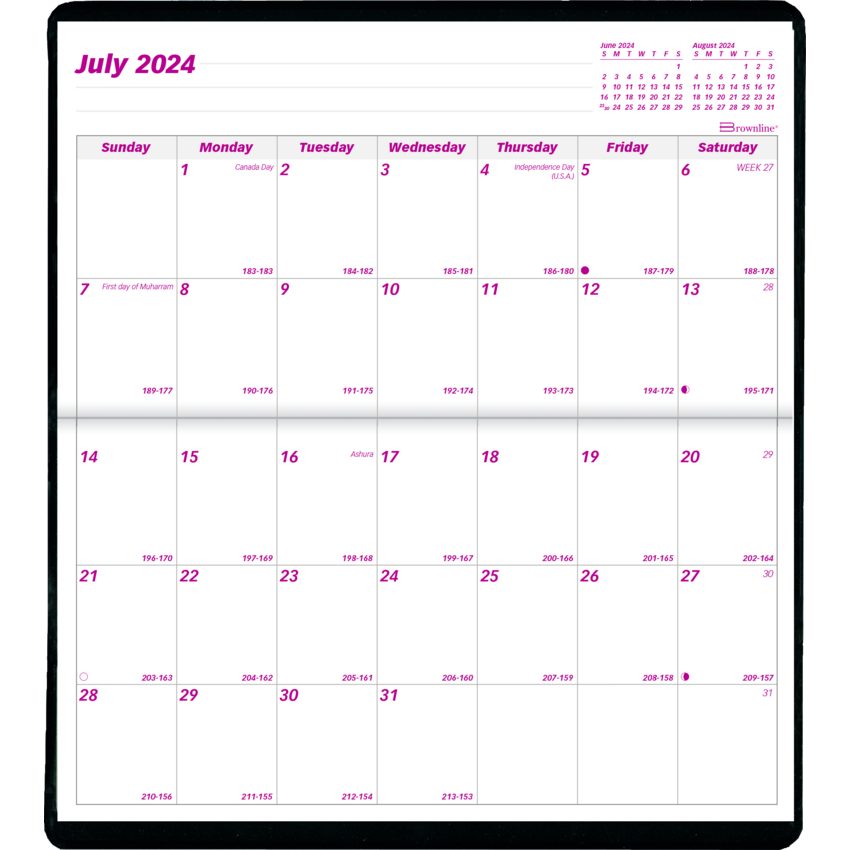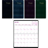 Contains a minimum of 50% post-consumer recycled material. FSC® Certified. Stitched bound. Soft vinyl jacket. 1 month per 2-page spread. 18 months, July to December. Individual daily boxes. Spaces for notes. 6-1/2" x 3-1/2". English. Assorted Colours.