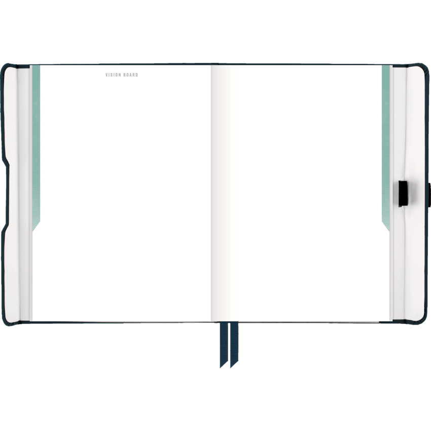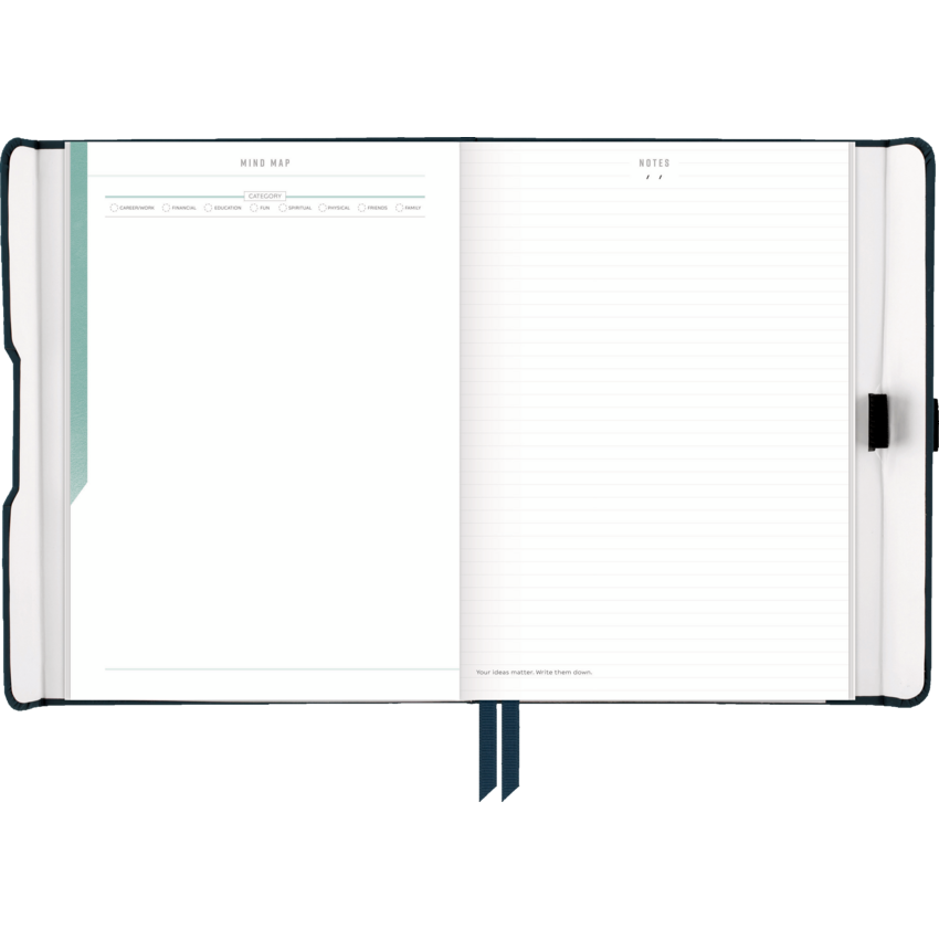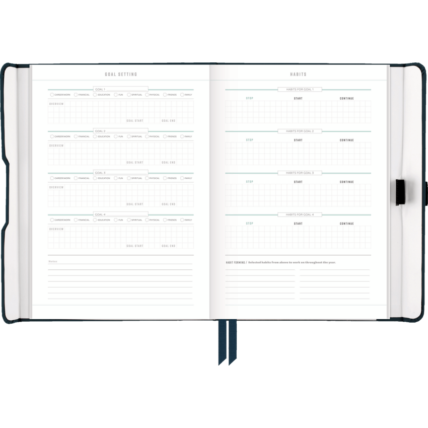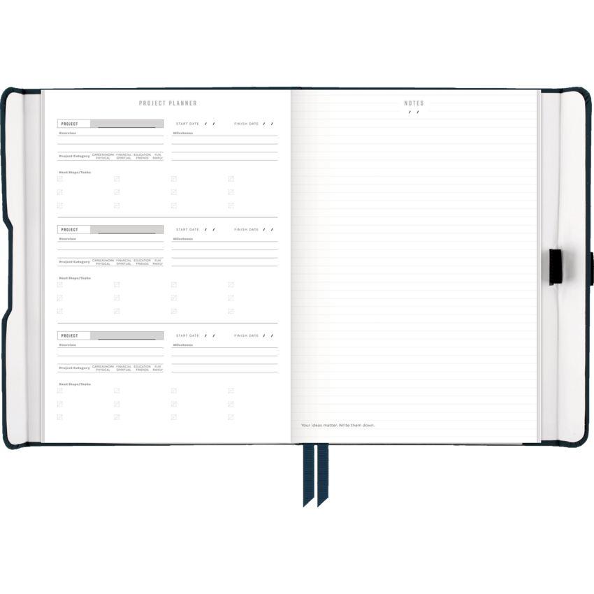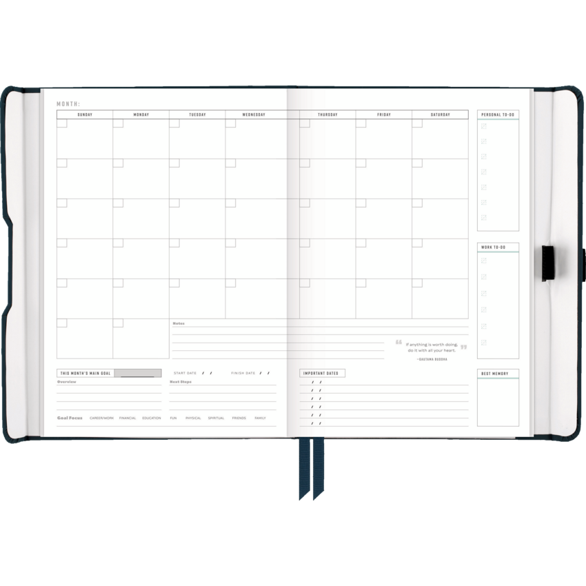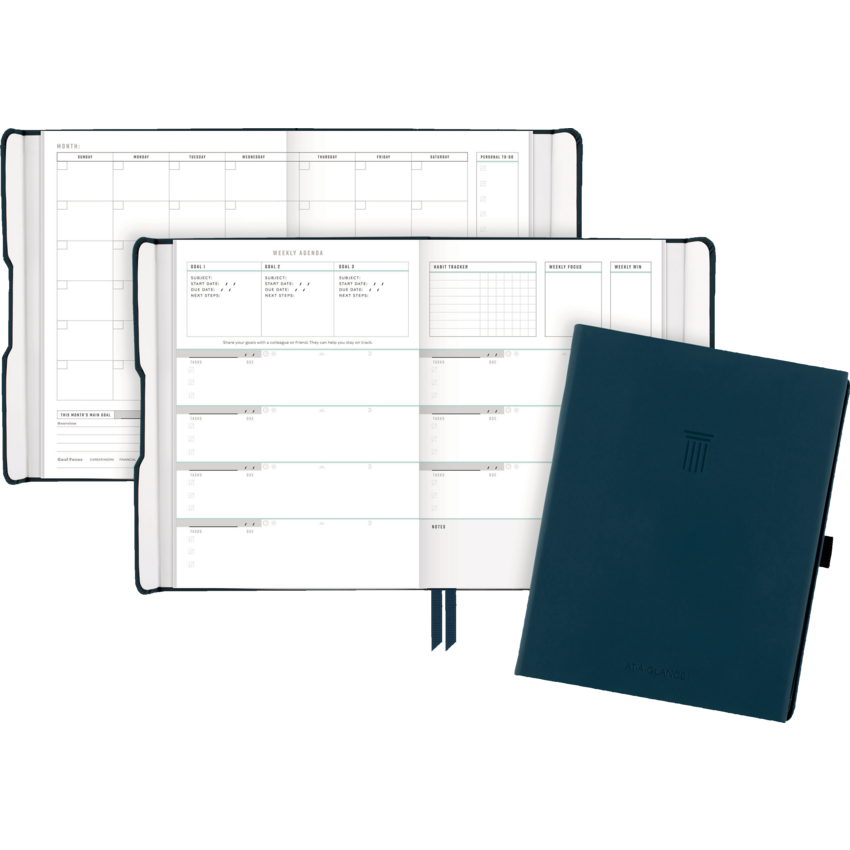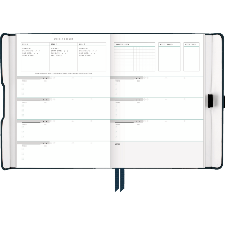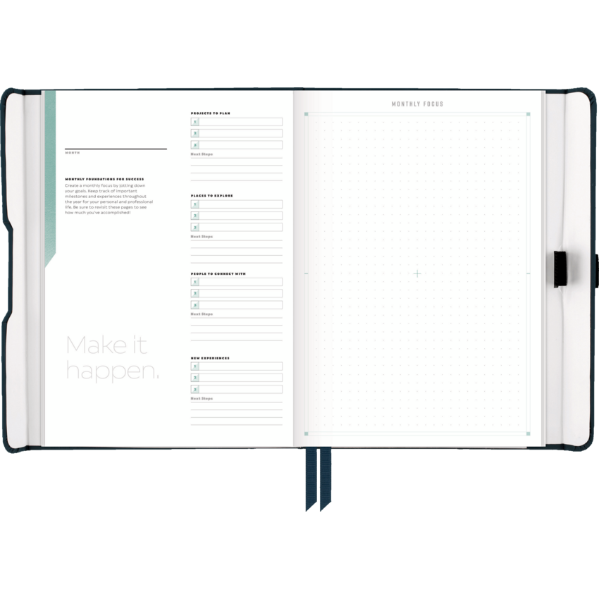 The three-step system serves as a guide to envision goals, create actionable tasks and develop consistent planning habits. Faux leather hard cover with magnetic closure. Weekly: 2 pages per week. Monthly: 2 pages per month. Features gusseted pockets, ribbon bookmark, 2 pen loops, stickers, and ink bleed resistant paper. 8-1/2" x 6-3/4". Blue.