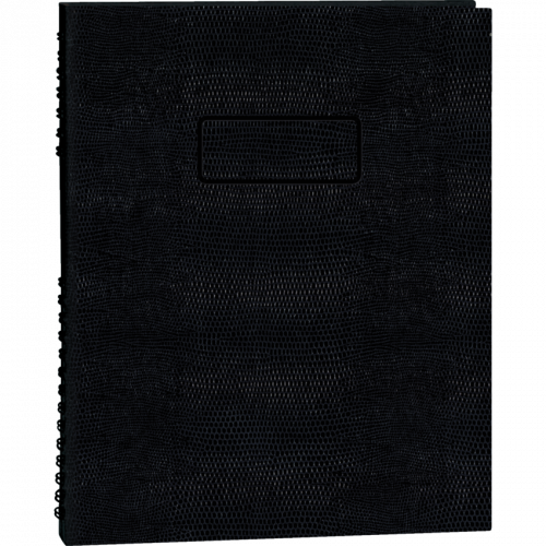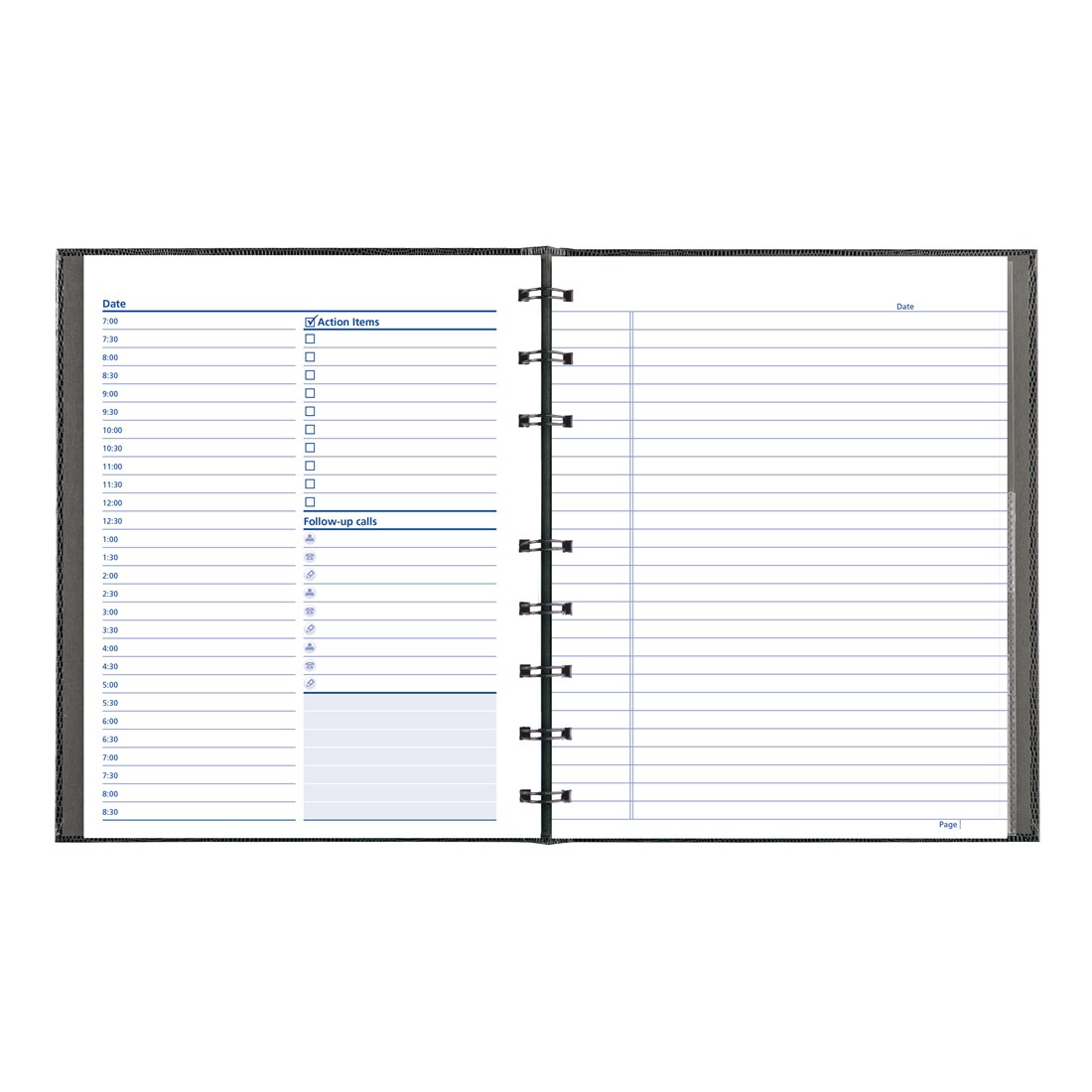 Planner page on left with ruled page on right side. Refillable with MiracleBind™ sheets. Contains a minimum of 50% post-consumer recycled material. FSC® Certified. Hard, lizard-like cover. Twin wire bound. 7:00 a.m. to 11:00 p.m. in 30-minute intervals. 200 pages. Self-adhesive tabs, index sheet, complete utility section and storage pocket. 10-3/4" x 8-1/2". Bilingual. Black.