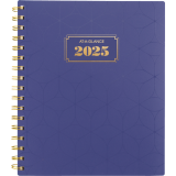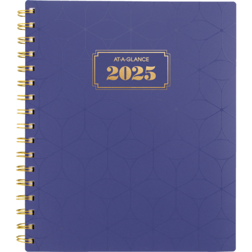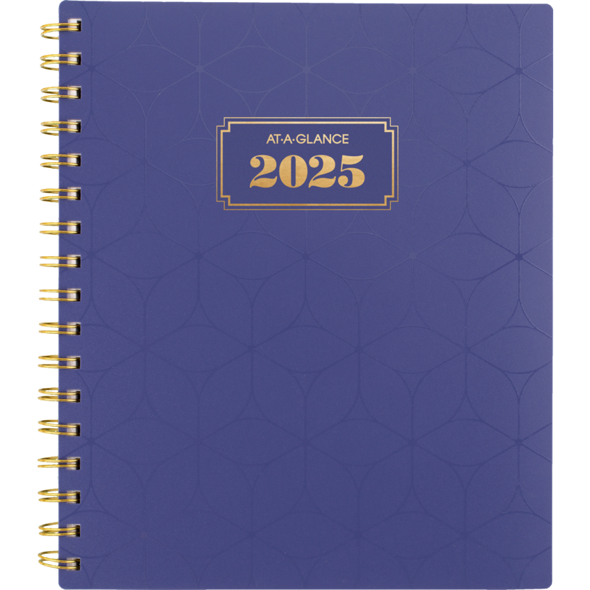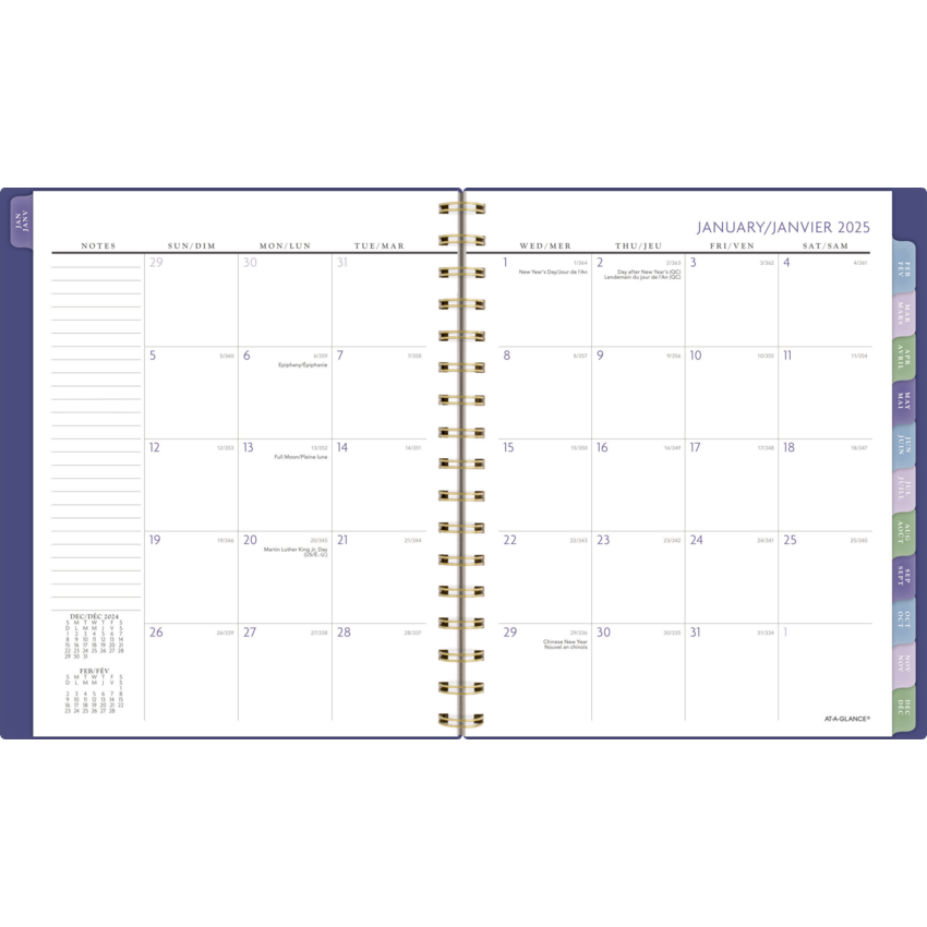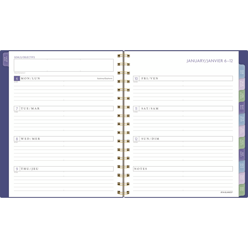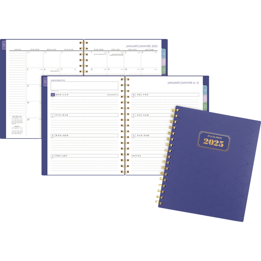 Twin wire bound. Poly cover with gold foil. Weekly: 2 pages per week. Monthly: 2 pages per month. 13 months January-January. Features lined weekly goals section on each weekly spread. Reference calendars, future planning, holiday, contacts, and notes pages. Double-sided poly pocket, and full set of colorful stickers. 8-3/4" x 7-3/8". Bilingual. Blue.
