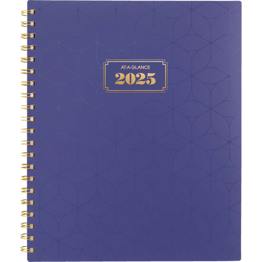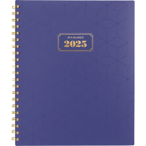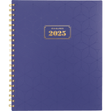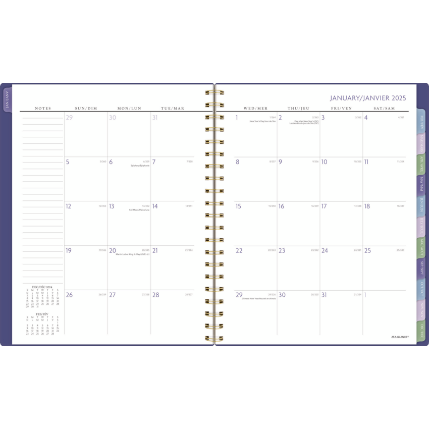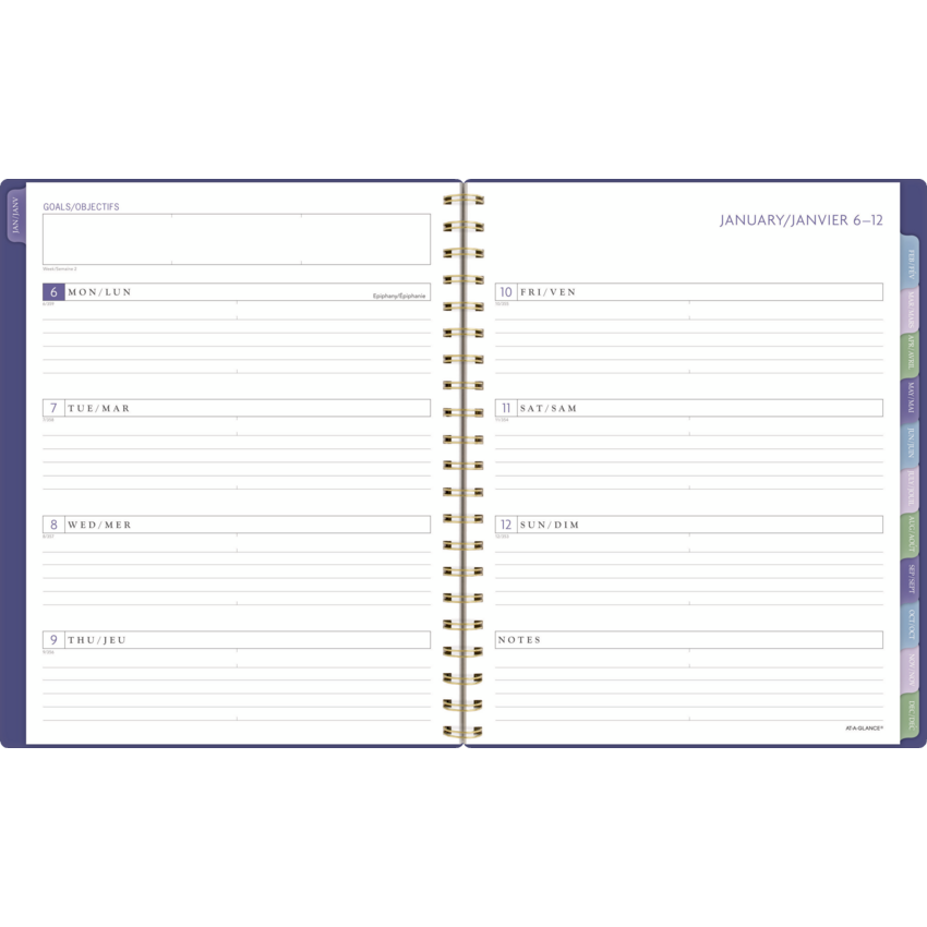 Twin wire bound. Poly cover with gold foil. Weekly: 2 pages per week. Monthly: 2 pages per month. 13 months January-January. Features lined weekly goals section on each weekly spread. Reference calendars, future planning, holiday, contacts, and notes pages. Double-sided poly pocket, and full set of colorful stickers. 11" x 9". Bilingual. Blue.